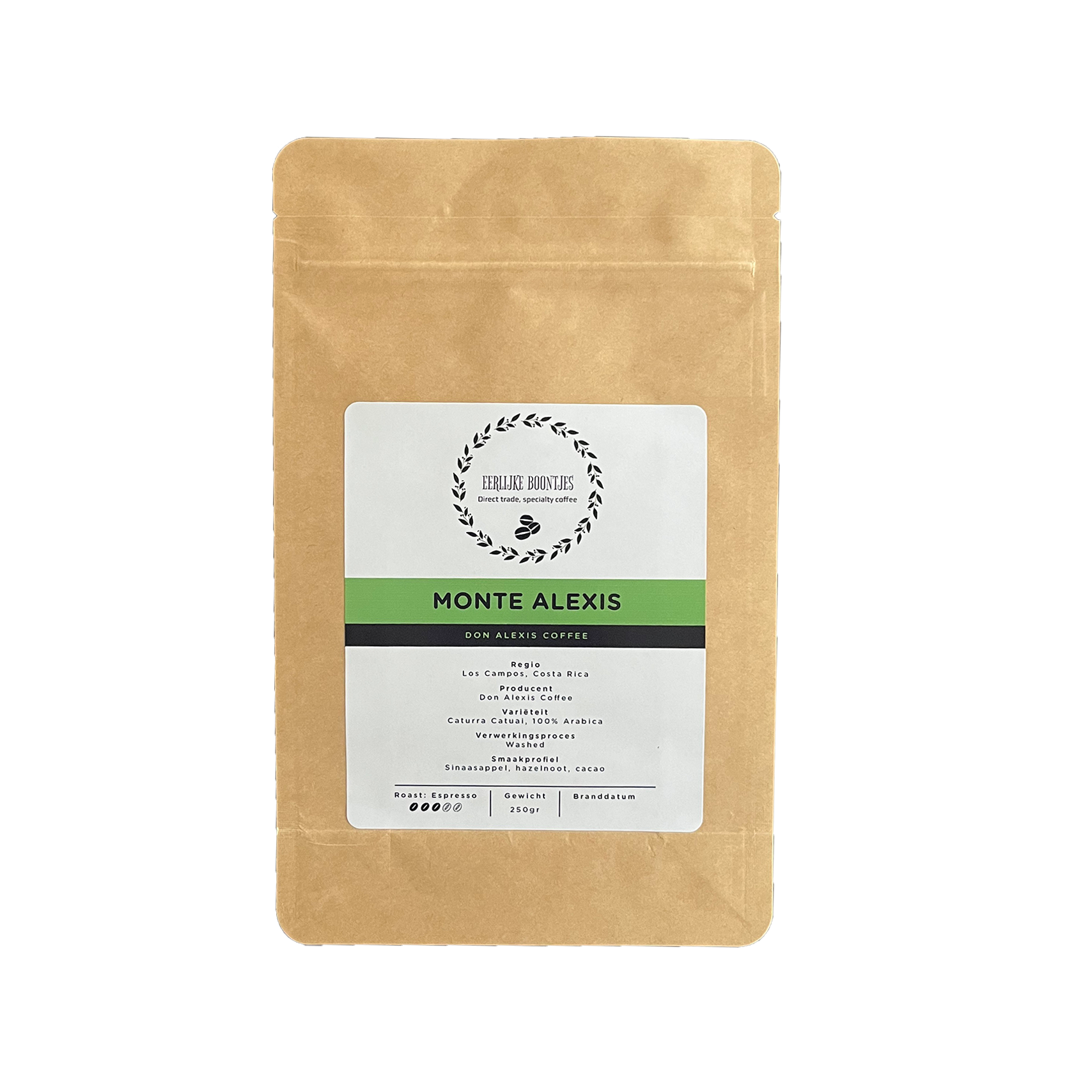 In de bergen van Costa Rica verbouwt Don Alexis zijn koffie met zorg en toewijding. Monte Alexis onderscheidt zich door volle tonen van cacao en hazelnoot, verfijnd afgerond met een vleugje sinaasappel. Deze koffie is zeer geschikt voor espresso, cappuccino én filterkoffie.